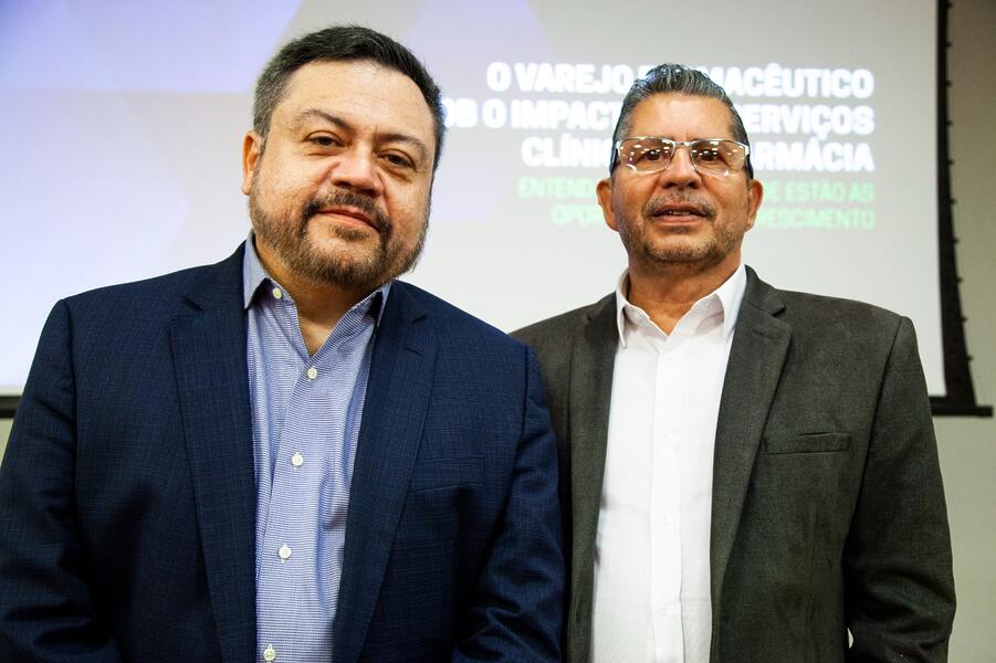 Sergio Mena Barreto, CEO da Abrafarma, ao lado de Paulo Gomes. Grandes redes protagonizam advento da assistência farmacêutica - Sergio Mena Barreto, CEO da Abrafarma, ao lado de Paulo Gomes. Grandes redes protagonizam advento da assistência farmacêutica